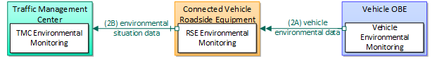 Dependencies and interactions between information flow triples. These relationships come in three types: “Interactive” relationship between triples means that one triple may prompt a response by the physical object for the other triple. “Request-response” relationship means that a request message on one triple will prompt a response message by the physical object for the other triple. A “depends-on” relationship means that one triple cannot be implemented without the other triple. Typically, a flow output by a physical object 'depends-on' a flow received by the physical object, as illustrated below, where the 'environmental situation data' flow sent by the Connected Vehicle Roadside Equipment depends on the 'vehicle environmental data' flow it receives.