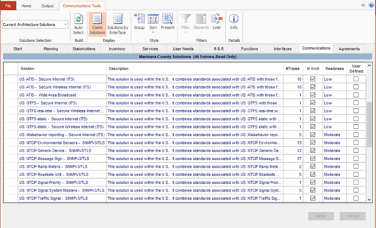 ARC-IT maintains a mapping of information flows to ITS standards development activities. The Communications View pages of the ARC-IT website. Go to www.arc-it.net and select Architecture / Views / Communications. This includes the latest mapping between ARC-IT and the ITS communications standards. RAD-IT accesses this mapping information and makes it available for customization and tailored standards activity tables. The "Communications" tab in RAD-IT provides the opportunity to decide which of the communications solutions and ITS Standards activities best applies to the region. Use the Communications tab in RAD-IT to see the full list of standards are part of the architecture and use it when there are unique situations for your region, e.g. your state/region requires a certain standard interface for certain elements and you need to show that at the regional level.
