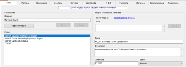 For a project architecture defined in RAD-IT, the same components can be defined as for the regional ITS architecture. In general, for each of the tabs in RAD-IT the starting set of information is that contained in the regional ITS architecture for that tab and the developer can select the subset of the information (from the regional ITS architecture) that is relevant to the project.