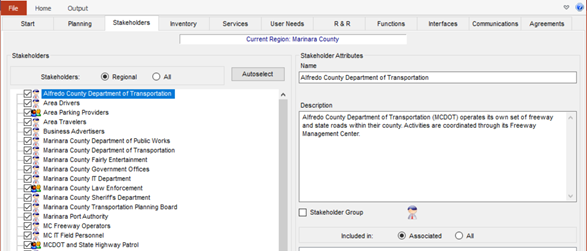 You can also use RAD-IT to create groups of stakeholders. Sometimes a stakeholder may belong to a larger organization and it may be the larger organization that is technically owning or managing an ITS system. In the example above you can see the 'group' icon in RAD-IT that has the multiple heads next to the name.
