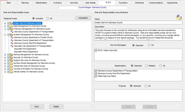 Stakeholder roles and responsibilities (R&Rs) are defined as part of the regional ITS architecture.