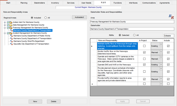 The inventory identifies the stakeholders that are associated with each system in the region and the service packages identify the services that those systems will provide. Here, each stakeholder's current and future roles and responsibilities (R&Rs) are defined in more detail.