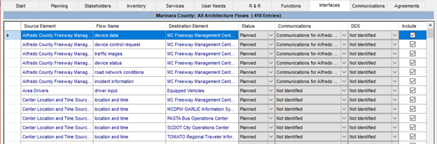 There are various views and customization options for this tab. The view below shows the information exchange tab, when the interfaces have been added for the region or project. For the information flows between elements, each information flow is described by a source element (where the information originates), a destination element (where the information is sent) and a descriptive name for the information itself. The high-level status of the information flow (e.g., existing, planned, future, etc.), and whether it is included in the architecture or not, are also shown in this view of the Interfaces tab.